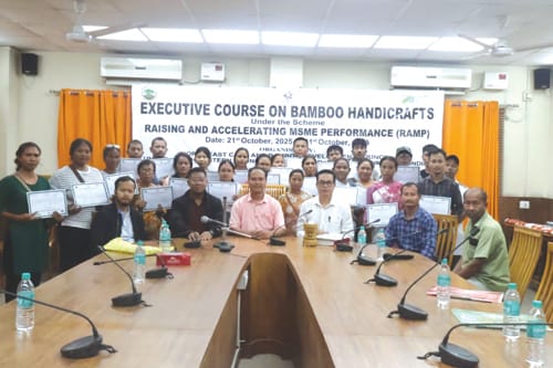 Nongpoh, Risaw, 31: Kumba 25 ngut ki samla na kylleng ki district jong ka jylla Meghalaya kila ïoh ka jingmyntoi kaba khraw hadien ba kila pyndep ïa ka prokram ai jinghikai ba 2 taiew lynter halor kumno ban shna ïa ki jait jingshna bapher bapher da kaba pyndonkam tang da u siej ba la tip kum ka “Executive Course On Bamboo Handicrafts & Utility Products Making” hapoh ka skhim “Raising And Accelerating MSME Performance (RAMP)” ba la pynlong da ka tnad Commerce & Industries jong ka sorkar Meghalaya ha ka jingïatreilang bad ka North East Cane and Bamboo Development Council.
