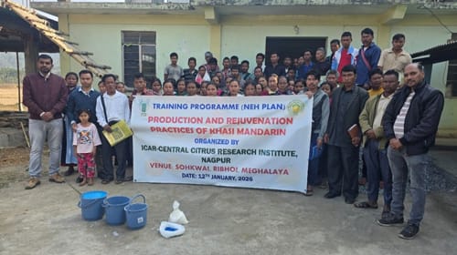 Nongpoh, K’Lyngkot 14: Ka ICAR-Central Citrus Research Institute, Nagpur lyngba ka NEH Plan kala pynlong ïaka prokram ai jinghikai ba shisngi halor kumno ban kyntiew ïaka jingpynmih ïa u sohñiamtra khasi ne Khasi Mandarin haka shnong Sohkhwai ha Ri-Bhoi District, bad ïa katei ka jingïalang la pynlong hapoh ka jingpynïaid jong u Dr Dilip Ghosh Director, ka ICAR-CCRI Nagpur da ka jingkyrshan lang u Dr Evening Stone Marboh Senior Scientist, Regional Research Centre for Citrus (RRCC), Biswanath Chariali.