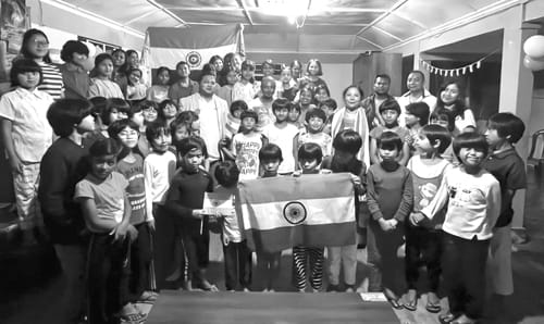 Shillong, Nailar, 16: Kum ka jingrakhe ïa ka jingïoh laitluid kaba 76 snem ka ri India, u Bah Michael Kharsyntiew ha ka 15 tarik u Nailar, 2022 u la leit jngoh ïa ki khunswet kiba la ri bad sumar ha A W Thomas Girls Home Orphanage kaba don ha Jaïaw Lumsyntiew, ïa kaba la pynïaid da ka Khasi Jaintia Presbyterian Synod.
