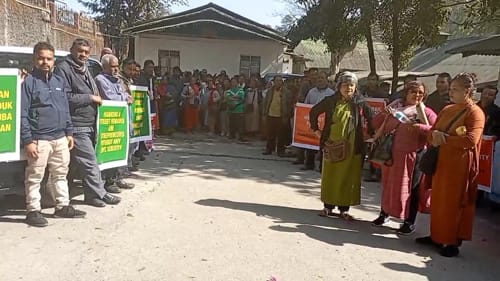 Shillong, K’lyngkot, 23: Ki nongdie madan kiba don hapoh ka shatri jong ka Meghalaya Greater Shillong Progressive Hawkers and Street Vendors’ Association (MGSPHSVA) ha ka sngi Thohdieng ki la tur sha ka ophis treikam jong ka Shillong Municipal Board ryngkat ki plakad ban pyrshah ïa ka jingpynbna ba la pynmih dang shen na ka bynta ban pynkynriah lut ïa ki nongdie madan na Khyndai Lad naduh ka 7 tarik, Rymphang,