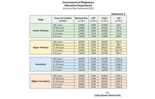 21,000 haduh 22,680 tyngka ïa ki Nonghikai Lower Primary,24,250 haduh 26,190 tyngka ïa ki Nonghikai Upper Primary, 34,25 haduh 36,990 tyngka ïa ki Nonghikai Secondary, 36,500–39,420 tyngka ïa ki Nonghikai Higher Secondary tangba ia kito kiba la hikai la palat 28 snem ka tulop jongki kan kham heh shuh shuh.
