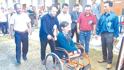 Shillong, Naitung 08 : U Bah Banteidor Lyngdoh, MLA ka Mawkynrew bad Myntri ba dei khmih ïa ka tnad kam rep ka Sorkar Jylla ha ka 07 tarik u Naitung, 2022 u la aiti da ka wheel chair sha kawei ka khynnah skul jong ka Raid Lynshiang SSA bad RMSA School, Mawsna kaba don jingduna ha ki dkhot met kata kaba bym lah ban ïaid.