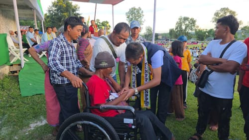 Ïa kitei ki Wheelchair la wan ban sam da u President ka State NPYF bad u MLA ka Jowai u Bah Wailadmiki Shylla kum u kongsan bad u MLA ka Umroi u Bah Damanbait Lamare kum u symbut kongsan ha ka jingïalang kaba la long ha ka sngi Saitjaiñ ha ka Shnong Kyrdem.