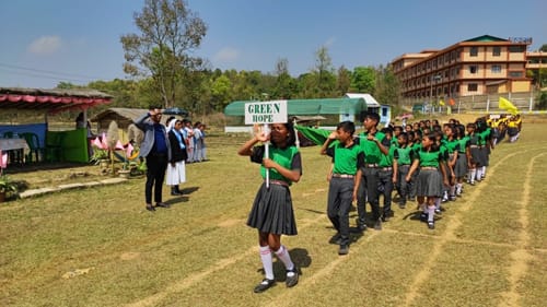 Ha ka sngi plie pyrda ïa kane ka Annual Sport Meet, la sdang shwa da ka jingïaid ïa ka March Pass ba la shimbynta da ki khynnah skul jong ka Red House, Blue House, Yellow House bad Green House, la pynbud pat da ka jingthang ïa ka sharak kum ka dak ban bud thik ïa ki kyndon ïalehkai sport ryngkat ka jingbam smai da ki khynnah skul bad pynphuh phieng ruh da ki jingrwai, jingshad bad mass drill bala shim bynta da ki khynnah skul.