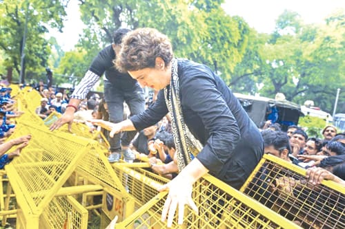 Ka jingïatur paidbah hapoh ka jingïalam ka Sonia Gandhi, ki la sdang ka jingïaid paidbah na Parliament Building ha kaba la ïadon lang u P. Chidambaram, u Mallikarjun Kharge, u Jairam Ramesh, Ranjeet Ranjan, u Rahul Gandhi, ka Priyanka Gandhi Vahdra kiba la riam da ki jaiñ ïong. Hynrei namar ba ki Pulit ki la ker pahara bha da ki briew bad ki jingker nar, ka Priyanka Gandhi kynsan kynsan, ka la kiew ïa kine ki jingker ryngkat ka pyrta shla ïa ka sorkar jong u Modi.