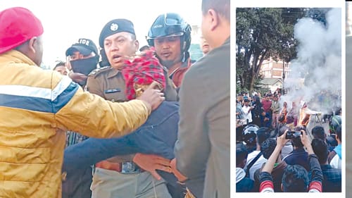 Ha ka jingïania kaba la neh kumba sawphew san minit, khatduh ki Magistrate bad ki Pulit ki la lah ban pynkohnguh ïa ki dkhot jong ki san tylli ki Sengbhalang ban thang ïa ki dur tynshop hapdeng ka surok mar pyrshah bad ka khyrdop jong ka Orchid Hotel, Shillong kaba jngai kumba shi pda maw na ka ingsah jong u Myntri Rangbah.