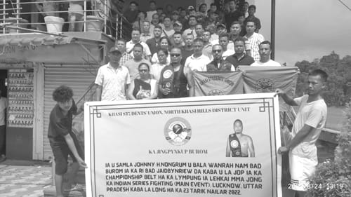 Nongpoh, Nailar 24: Namar ka jingsarong bad ka jingkmen halor ka nam jop bala wanrah da u Samla Johny Nongrum u ba dei ruh u Sports Secretary ka kSU North Khasi Hills District, naka jingïakhun MMA Indian Fight Series kaba la long ha Lucknow, Uttar Pradesh, ka KSU North Khasi Hills District mynta ka sngi kala pdiang burom ïa utei u samla ha Byrnihat. Ha kane ka jingïalang pynkup burom ïa u Samla Johnny Nongrum da ki nongïalam ka KSU NKHD Unit la don ryngkat naduh u Bah Lambok Joseph Rymbai Vice-president KSU NKHD Unit, Ki nongïalam ka KSU Byrnihat Circle, Nongpoh Circle, KSU Northern Border Area bad kiba ha ïing hasem u Samla Johnny Nongrum.