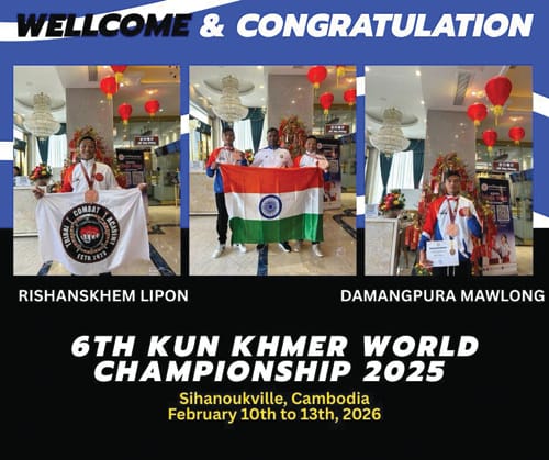 SHILLONG, Rymphang 16: Ar ngut ki samla ïalehkai jong ka jylla Meghalaya ba kynthup ïa u Rishanskhem P Lipon bad u Damangpura L Mawlong ki la ïoh ban khur takma rnong ha ka 6th Khun Khmer World Championship 2026 kaba la long ha Shanoukville, Cambodia.