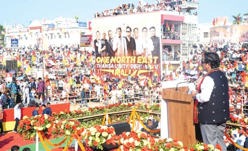 Shillong, Naiwieng 27: U Myntri Rangbah ka jylla u bad u President ka National People’s Party (NPP), u Conrad K. Sangma, ha ka sngi Palei u la shim bynta ha ka “The One North East Thansa (Unity) Rally” kaba la long ha madan Astabal, Agartala ha kaba da ki hajar ngut ki paidbah ki la ïalum lang ban sakhi ïa ka jingïalong kawei hapdeng ki nongïalam jong kane ka thaiñ ha kaba na ka liang jong u Conrad u la banjur ïa ka jingdonkam ban ïalong kawei ha kane ka thaiñ shateilammingi.