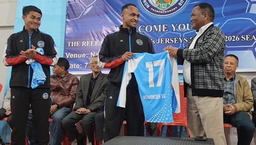 Shillong, Ïaiong 07 : Ka Nongkseh Sports Social and Cultural Club hapoh ka jingïalam jong u President, Bah Daniel Thangkhiew ha ka sngi Ba-ar ki la pyllait paidbah ïa ki jersey, ki track-suit bad kumjuh ïa ki tïar ïalehkai jong ka kynhun na bynta ka lympung ïalehkai Meghalaya State League kaban sa sdang noh shen mynta u bnai.