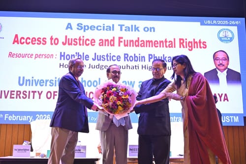 Ha kane ka sngi u Justice Robin Phukan, u nongbishar jong ka Gauhati High Court u la wan ban shim bynta kum u kongsan ban ai ka jingshai halor kumno ki paidbah kin ioh ïaka jingbishar ba hok. Ha kane ka sngi la sakhi ruh da ka jingdonlang u M Hoque Chancellor ka skulbah USTM, Prof. G. D. Sharma, Vice Chancellor, Prof. Subhram Rajkhowa, Professor Emeritus, ka Dr Anurekha Goswami, Dean, University School of Law and Research (USLR).