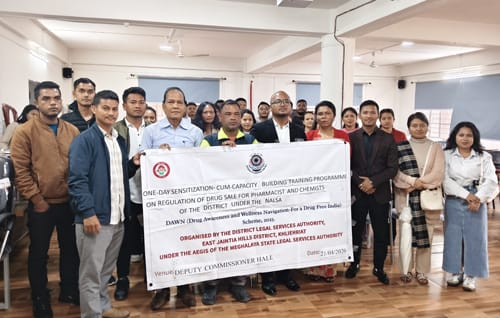 Khliehriat Ïaïong 21: Ka tnat District Legal Services Authority (DLSA), East Jaiñtia Hills District mynta ka sngi ka la pynlong ïa ka prokram ba kyrpang na ka bynta ki nong die dawai ne ki Pharmacists bad ki Chemists kiba don hapoh ka district kiba hapoh ka NALSA’s DAWN (Drug Awareness and Wellness Navigation- for a Drug Free India) Scheme, 2025, ïa kane ka prokram la tip kum ka Sensitization cum Capacity Building Training Programme ba kiba die dawai kim dei ban die beaiñ, hynrei ka dei ban long katkum ka aiñ kaba ïadei bad ka Drugs and Cosmetics Act 1940, NALSA’s DAWN khnang ban lait na ka jingpyndonkam bakla ïa ki dawai na ka bynta ka jingshngaiñ ki paidbah, ïa ka prokram la pynlong ha Conference Hall ha ophis u Deputy Commissioner, East Jaiñtia Hills District, ha Khliehriat.