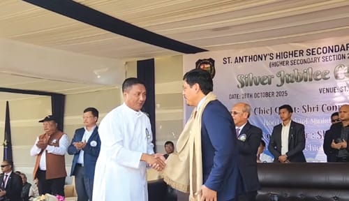 Shillong, Risaw 29: U Myntri Rangbah ka Jylla Conrad K Sangma ha ka sngi Ba-ar u la hiar sha Pynursla ryngkat bad u MLA ka thain ba dei ruh u Symbud Myntri Rangbah ka Jylla Bah Prestone Tynsong ban snohkti lang ha ka jingrakhe ïa ka Jubili Rupa jong ka skul St. Anthony’s Higher Secondary, Pynursla.