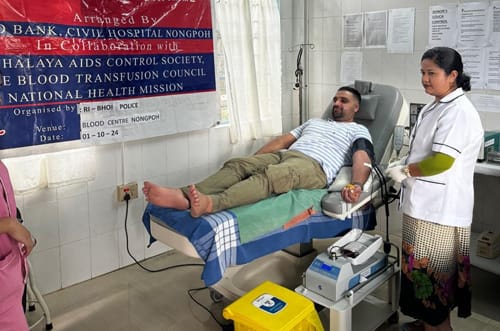 Nongpoh, Risaw 01: Ki pulit jong ka Ri-Bhoi District hapoh ka jingïalam jong u Supreintendent of Police u Jagpal Singh Dhanoa, ryngkat kiwei ki pulit ophisar, ki langrut da ka mynsiem ba kylluid mynta ka sngi kila leit ban synñiang ïala ka jong ka snam ha Blood Bank jong ka Nongpoh Civil Hospital kaba dei ruh shibynta jong ka jingrakhe ïaka National Voluntary Blood Donation Day.