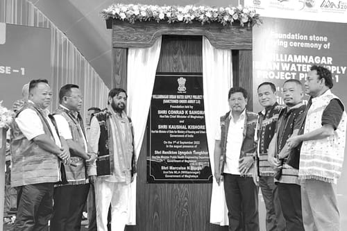 Shillong, Nailur, 01: U Myntri Rangbah ka Jylla u Conrad K Sangma bad u Myntri Khynnah ka Sorkar Pdeng uba peit ïa ka Ministry of Housing bad Urban Affairs ha ka sngi Palei ki la buh ïa u mawnongrim ban tei ïa ka Williamnagar Urban Water Supply Project Phase-I ha kaba la sakhi lang da u Myntri ka tnat PHE ka Sorkar Jylla u Bah Renikton Lyngdoh Tongkhar bad ki MLA ba kynthup ïa u Marcuise Marak, u Jim Sangma bad u Abdus Saleh.